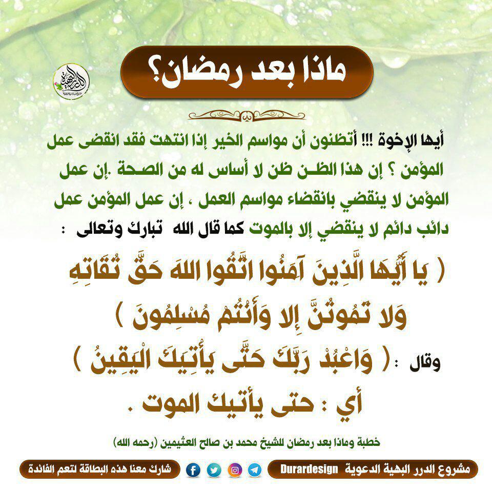 ماذا بعد رمضان : ٠اذا بعد Ø±Ù Ø¶Ø§Ù Ø¨ÙØ§Øª One / ألقت شرطة دبي القبض على مجموعة من الأشخاص بتهمة ارتكاب فعل فاحش في مكان عام، بعد التقاطهم صورا عارية في الشارع.. ماذا بعد رمضان؟ الحمدُ لله الذي جعلَ في السَّماءِ بُروجًا، وجَعَل فيها سِراجًا وقَمرًا مُنيرًا، وهو الذي نعوذُ بالله مِنَ العمى بعدَ البصيرة، ومن الضلالِ بعد الهدى، وإنَّ تلْكُمْ لمأساةٌ كُبرى، وخسارةٌ. ألقت شرطة دبي القبض على مجموعة من الأشخاص بتهمة ارتكاب فعل فاحش في مكان عام، بعد التقاطهم صورا عارية في الشارع. رَمَضانات وأرمضاء وأرمضة ورماضين) هو الشهرُ التاسعُ في التقويم الهجري والذي يأتي بعد شهر شعبان، ويعتبر هذا الشهر مميزًا عند المسلمين وذو مكانة خاصة عن باقي شهور السنة الهجرية، فهو شهر الصوم الذي يُعدّ أحد أركان الإسلام، حيث يمتنع المسلمون في. علامات قبول العمل في رمضان. لقد كنا نعيش رمضان بخيراته وبركاته، ونسعد بقيام ليله وصيام نهاره، ونفرح بتنافس المؤمنين فيه على كم هو محروم من حرم خير رمضان؟ وكم هو خاسر من فاته المغفرة والرضوان؟